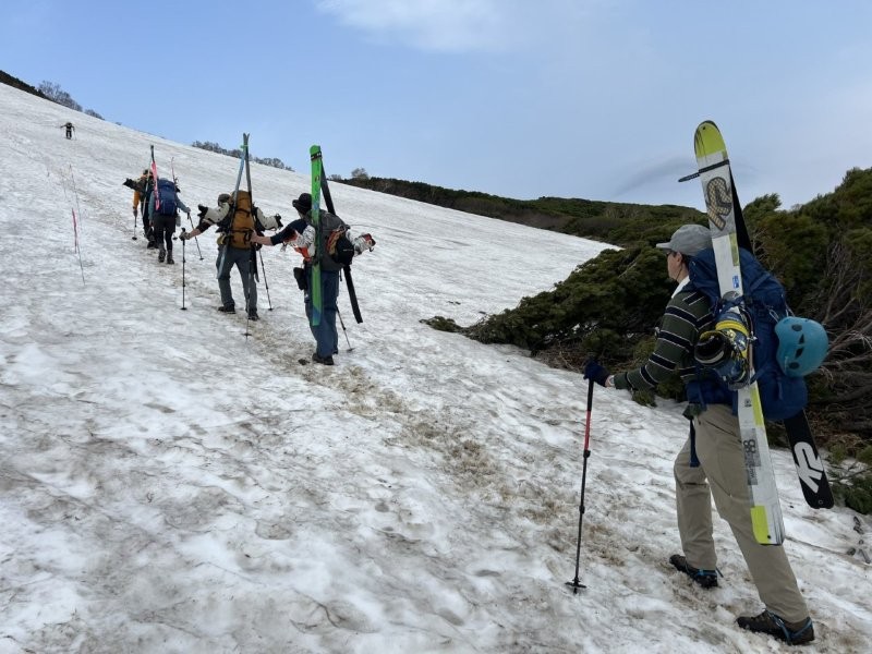 銀泉台からお花畑の花が咲き始めた第一雪渓、第二雪渓、第三雪渓、第四雪渓をつないで花を愛でながら登山道経由で赤岳山頂まで登って、下りはスキーで雪渓をつなぎながら北海道道1162号銀泉台線まで降り立つ。