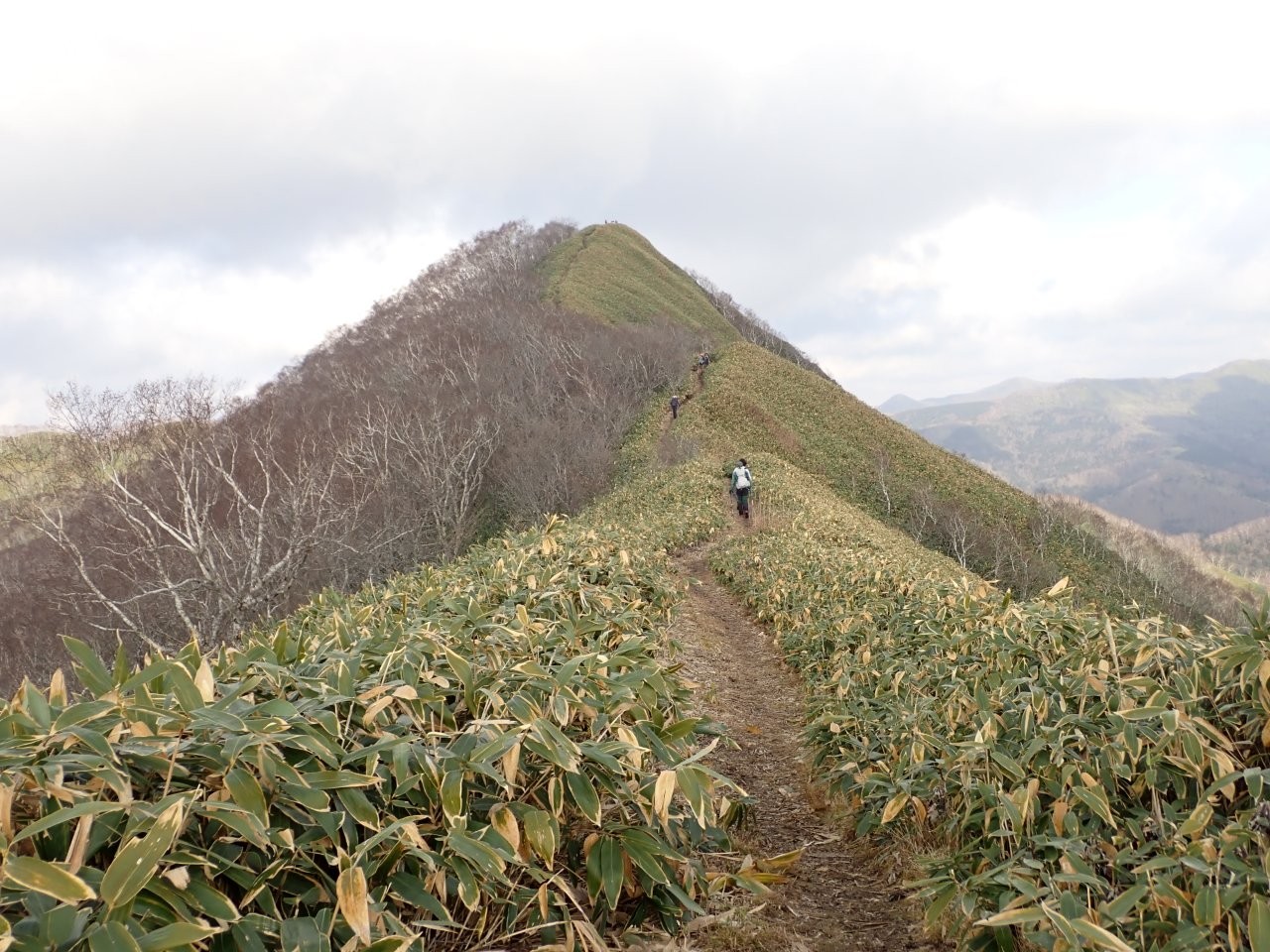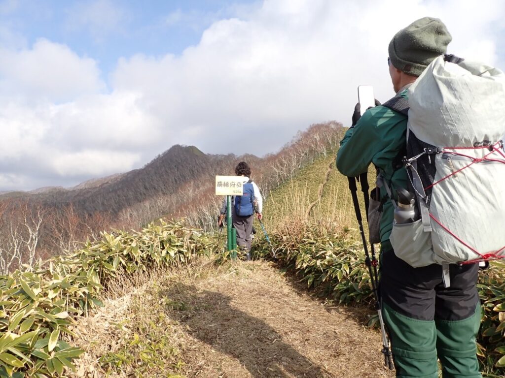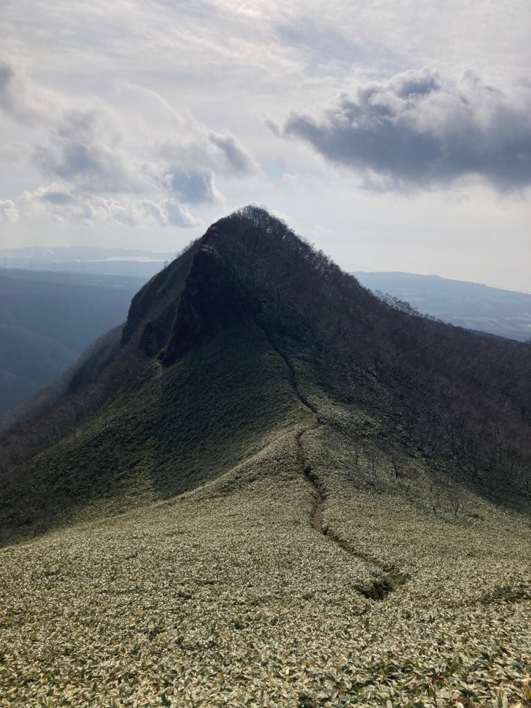 すっかり定着した養鶏場東側の廃屋跡を通って沢沿いに進み南西尾根に上がる登山道はしっかりしていたが、今後の登山道整備については難しくなっている噂も耳にする。数日来の暖気で積雪も消えて、積雪なしを見越した登山者が多く、登山口には車があふれ返っていた。尾根上部は開けており、標高600~700㍍の稜線とは思えぬ樹林なしのすっきりした尾根が連なる。雪がつけばスキー滑降向きな幅広な地形が続き、振り返れば噴火湾を眺望するには実に心地よい山であった。