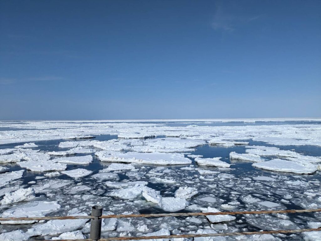 下山日の23日は暴風雨が吹き荒れる中の下山となり、虹も見られた。斜里側の海岸線では入山日にあった流氷が流されて消えていた。