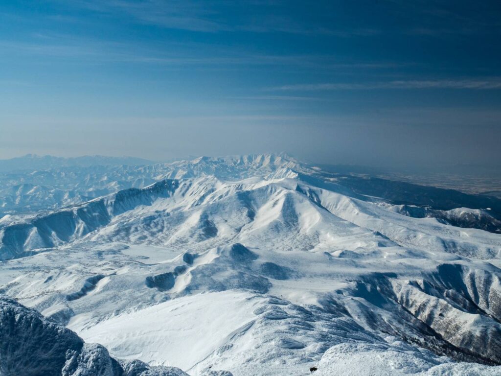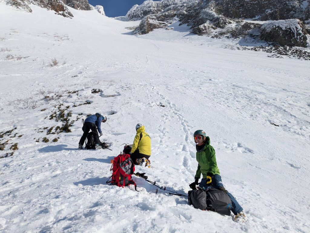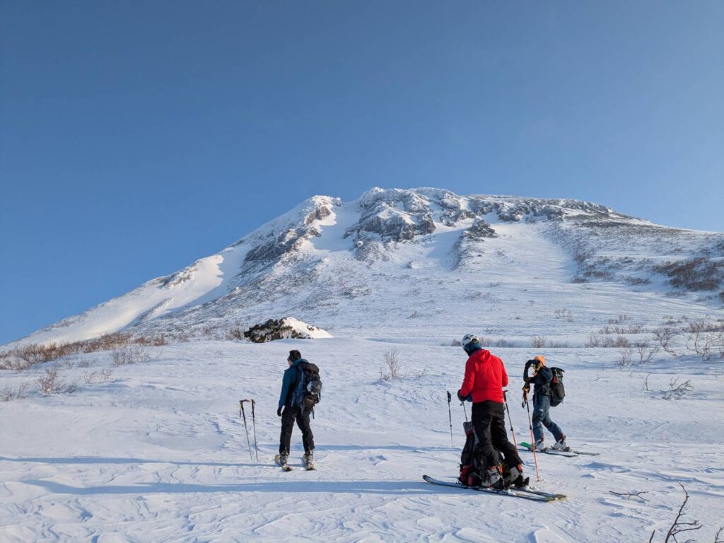 標高1100㍍まではスキーを使い、以降はアイゼン・ピッケルに切り替えルンゼを登ったが、1550㍍の南西ルンゼ終点、出口の直下50㍍はカリカリの氷化した急傾斜帯が続き、滑落しないよう、登下降は慎重を期した。4人で山頂に立ち、しばし感動の眺望に見入る。