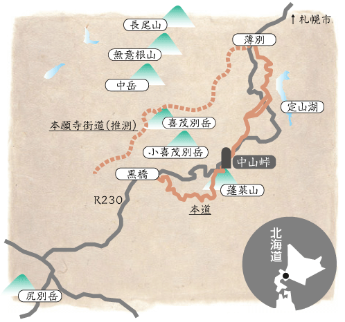 幕末に松浦武四郎も歩いた噴火湾岸から山並み(中山峠)を越えて札幌に至るルートは、明治維新により札幌が新たな北海道の中心となったことに伴って本願寺街道として開削され、明治、大正、昭和へという激動の時代の流れの中で幾度か寂れつつ、そのたびにルートを変えて改良され、名前を変えて復活、現在の国道230号に至るまで、重要な幹線道路として生き延びて来ました。