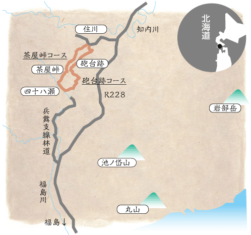 松浦武四郎が1859年(安政6年)に刊行した「東西蝦夷山川(えぞさんせん)地理取調図」でも描かれており、「小休所」と呼ばれる人馬の休みどころが設けられていたことが、江戸時代の絵図や記録でうかがい知ることができます。