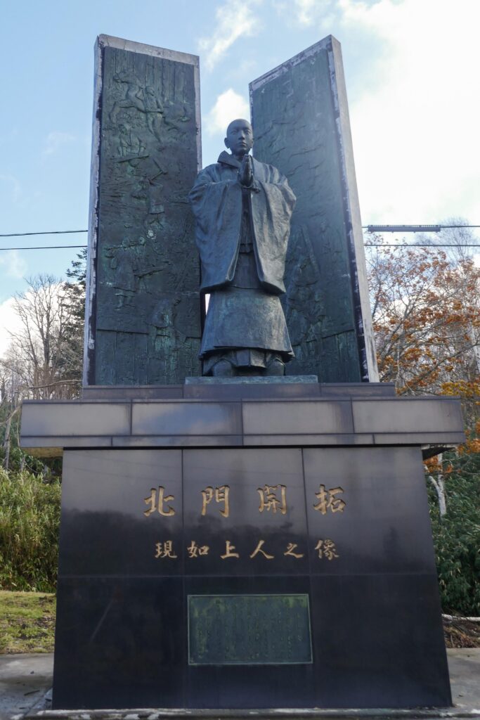 現在の中山峠は本当は本願寺街道が通っていた場所ではありませんが、ここには、東本願寺の新門跡として本願寺街道開削の大役を担って京都から北海道へ渡り、開削の責任者とされる「現如上(大谷光瑩)之像」や、「旧本願寺街道」の碑などが建立されており、この道の古く複雑な変遷の歴史を物語っています。