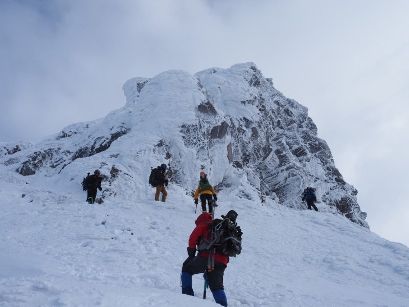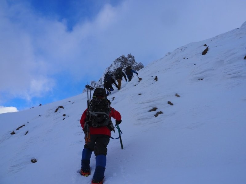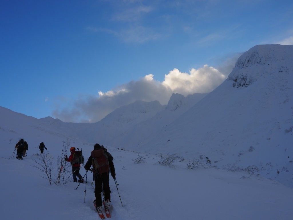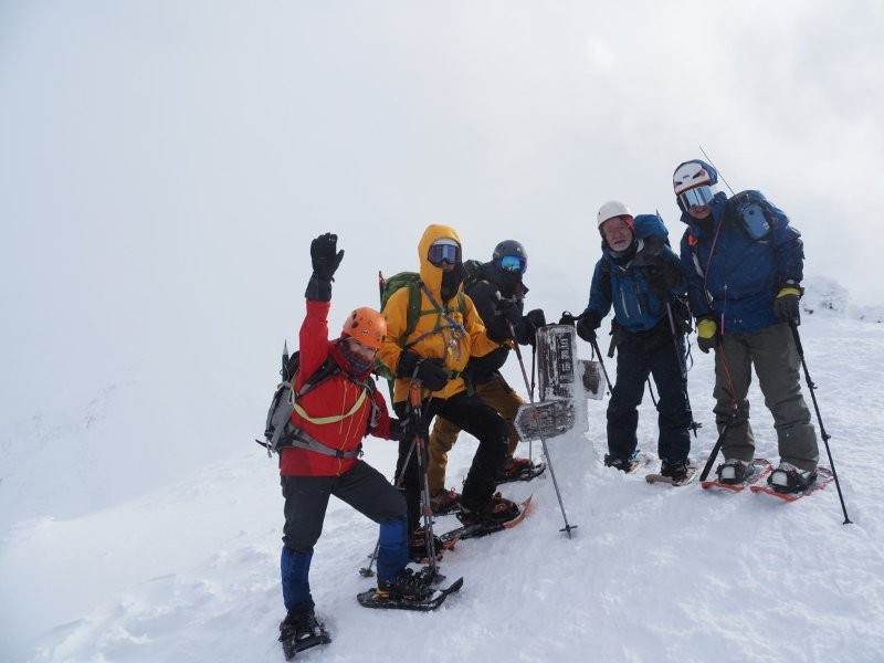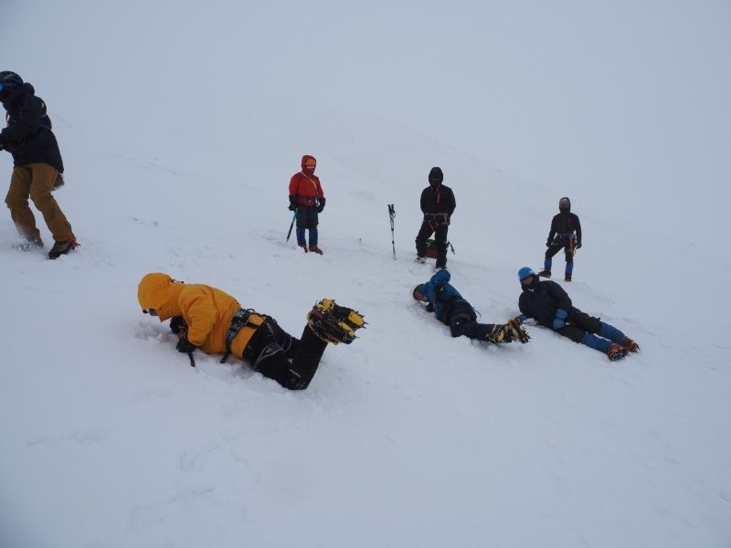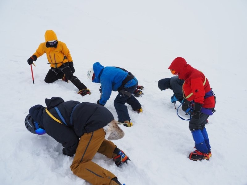 【研修山行】crampons&ice ax training ⑰ 研修山行 2025.12.07 2025.12.6-7、上ホロカメットク山山域 8人で氷雪(アイゼン&ピッケル)訓練を行い、積雪期のロープワークの基本と負傷者搬送作業など基本動作の確認に時間を割いた。