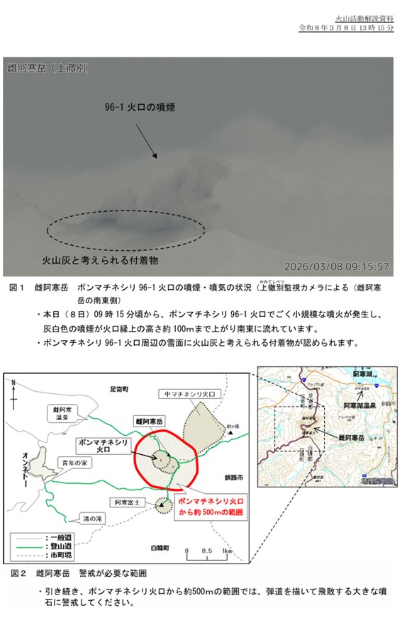 2026年3月8日 札幌管区気象台は3月8日9時35分、「8日午前9時15分ごろ、ポンマチネシリ火口で噴火が発生し、現在も継続中。噴煙は灰白色で火口縁上の高さ約100mまで上がり、南東に流れている。この噴火による大きな噴石の飛散は確認されていない」と発表した。
